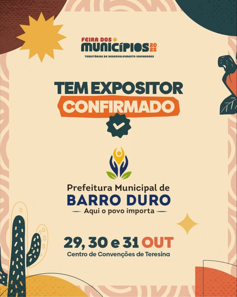 A Prefeitura Municipal de Barro Duro confirma presença na Feira dos Municípios 2025, evento que reúne o melhor da cultura, da inovação e do talento dos piauienses. O município participará representando o território de desenvolvimento Carnaubais, levando sua identidade, potencial e criatividade ao público do estado.