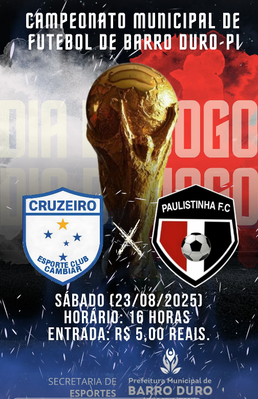 O Campeonato Municipal de Futebol de Barro Duro-PI segue agitando a cidade e promete fortes emoções neste sábado, 23 de agosto de 2025, com o confronto entre Cruzeiro Esporte Club Cambiar e Paulistinha F.C. A partida será realizada às 16 horas, e os torcedores poderão acompanhar o duelo pagando apenas R$ 5,00 de entrada. A iniciativa é promovida pela Secretaria de Esportes e pela Prefeitura Municipal de Barro Duro, incentivando a prática esportiva e a integração da comunidade local. Não perca a chance de torcer pelo seu time e vivenciar momentos de emoção e competitividade no futebol barrodurense.