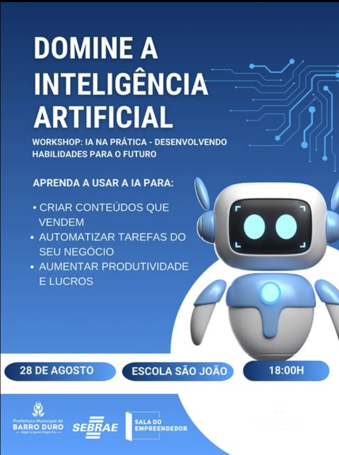 A Prefeitura de Barro Duro, em parceria com o Sebrae-PI e a Sala do Empreendedor, promove no dia 28 de agosto o workshop “IA na Prática – Desenvolvendo Habilidades para o Futuro”, voltado para empreendedores que desejam criar conteúdos que vendem, automatizar tarefas e aumentar produtividade e lucros.