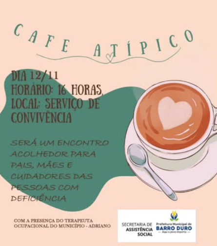 A Prefeitura Municipal de Barro Duro, por meio da Secretaria de Assistência Social, realizará nesta quarta-feira, 12 de novembro, às 16h, no Serviço de Convivência, o evento “Café Atípico” — um momento de escuta, diálogo e apoio voltado para pais, mães e cuidadores de pessoas com deficiência.