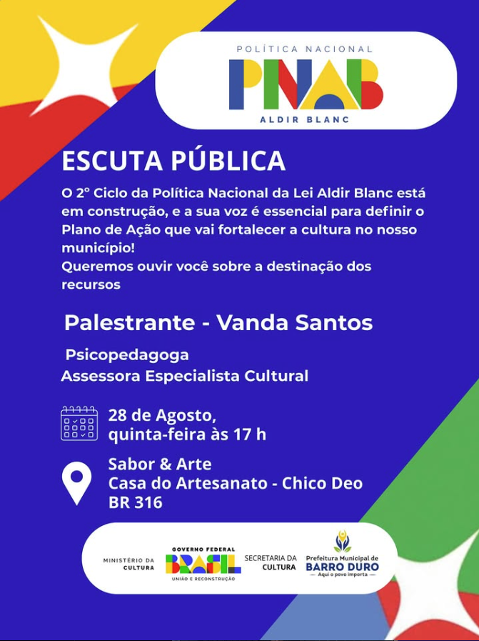 A Prefeitura de Barro Duro- Piaui, por meio da Secretaria Municipal de Cultura, convida todos os artistas, grupos culturais, produtores e fazedores de cultura para participarem da Escuta Pública que vai ajudar a construir o Plano de Ação da Lei Aldir Blanc – Ciclo 2 em nosso município.