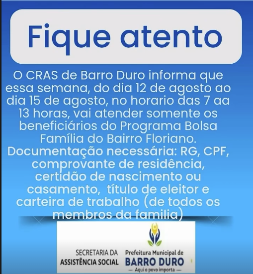 O Centro de Referência de Assistência Social (CRAS) de Barro Duro informa que, nesta semana, de 12 a 15 de agosto, no horário das 7h às 13h, o atendimento será exclusivo para beneficiários do Programa Bolsa Família residentes no Bairro Floriano.
