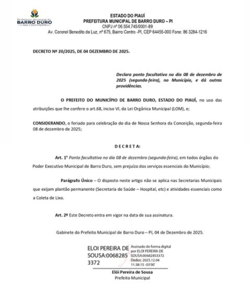 O Decreto Municipal nº 20/2025, datado de 04 de dezembro de 2025, dispõe sobre a decretação de ponto facultativo no âmbito do Poder Executivo de Barro Duro. O documento estabelece que o dia 08 de dezembro de 2025, segunda-feira, será considerado ponto facultativo em razão das comemorações do Dia de Nossa Senhora da Conceição, celebrado anualmente nesta data.