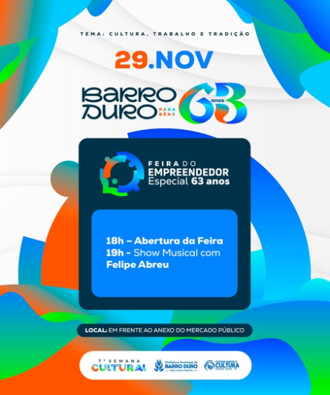 A Prefeitura Municipal de Barro Duro informa que a 7ª Semana Cultural de 2025 terá início no próximo dia 29 de novembro, dando abertura oficial às celebrações pelos 63 anos de Emancipação Política do município. Para marcar o início da programação, será realizada a Feira do Empreendedor – Especial 63 anos, um espaço dedicado à valorização do talento, da criatividade e da dedicação dos empreendedores locais.