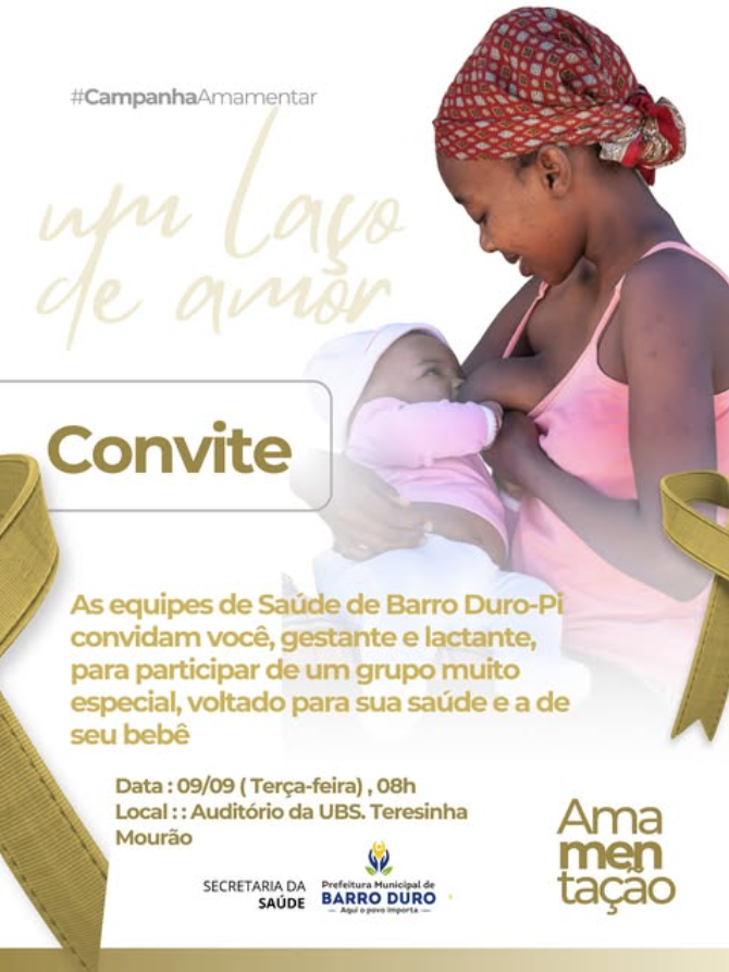 Amamentar é mais do que nutrir: é um gesto de amor que fortalece o vínculo entre mãe e bebê e garante mais saúde para ambos. Pensando nisso, a Prefeitura de Barro Duro, por meio da Secretaria de Saúde, realizará uma roda de conversa especial com gestantes e lactantes sobre a valorização da saúde da mulher e a importância da amamentação.